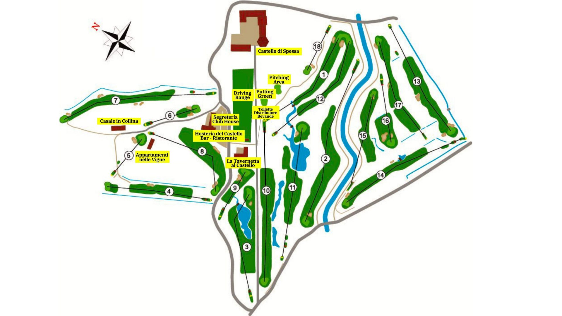 • Länge ca. 5.943 m mit vielen Wasserhindernissen und anspruchsvollen Grüns.